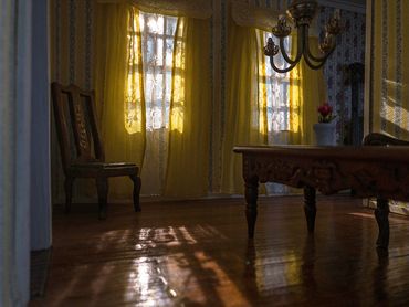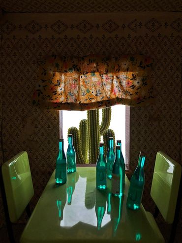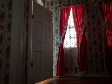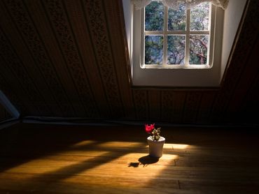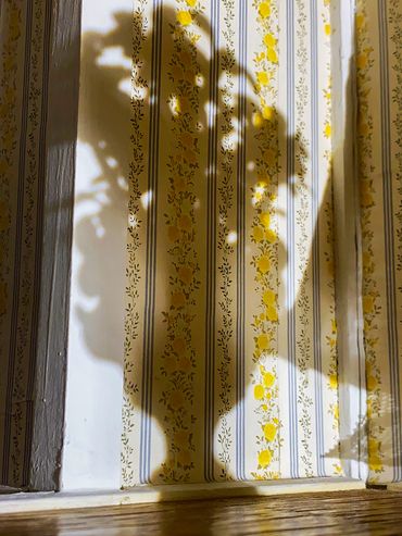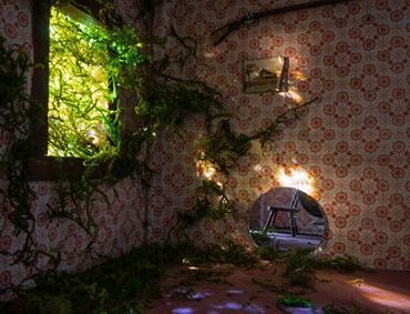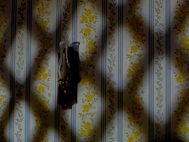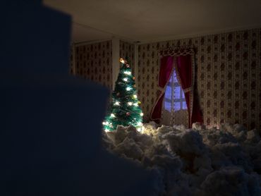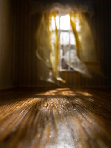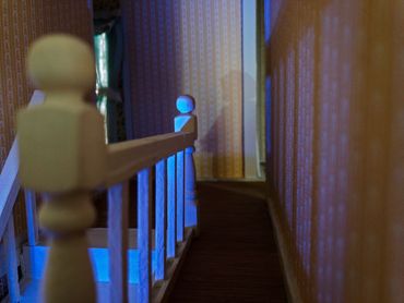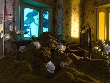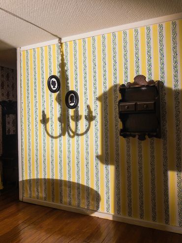 By being given these prebuilt houses and rooms such as the attic, bathroom, bedroom, living room, etc, I used the props that I had as a collaboration with the space to create new meaning. I chose not to tear down wallpaper or change paint colors or flooring in the houses but rather respond to the age, colors and traces left behind in the space to fuel the ideas for what the lighting, props, and photographic compositions would be. The interior/exterior narratives created in some of the photographs were in response to the pandemic and how so much of our exterior lives came into the living spaces of those fortunate enough to have a place to live.